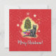 Das ist ein niedliches Weihnachtsdesign mit einem lebendigen, roten Hintergrund voller Sterne und winzigen Schneeflocken und einer schönen Katze vor einem Weihnachtsbaum. Schicken Sie Ihren Lieben Ihre liebevollen, gemütlichen und feierlichen Lebensräume!