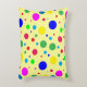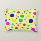 Dieses festliche Akzent Kissen ist mit Ballonkreisen in Blasen von Farben dekoriert: gelb, grün, türkis, blau, rot, orange und rosa.
