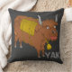 Braun, haarig, Cartoon Yak, lächelnd fröhlich. Er hat Taschen an seinem Rücken befestigt. Der Text kann angepasst oder entfernt werden.