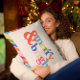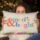 Niedliches typografisches und gestreiftes Urlaubskissen. Zu den Hauptmerkmalen zählen die Stimmung "Merry & Bright" in großen, mehrfarbigen Buchstaben über einem neutralen Hintergrund und ein gestreifter Rahmen in den Buchstaben passenden Farben. Zurück wird das Streifen-Muster fortgesetzt. Das gemütliche, lebendige Akzent Kissen mit beliebter Urlaubsstimmung. Ideal für Ihren Urlaub Dekoration und macht ein großartiges Geschenk. Prost!