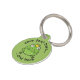 Grüner Frosch Cartoon mit goldener Krone. Prinzfrosch. Benutzerdefinierte Hintergrundfarbe. Zwei benutzerdefinierte Textfelder im Kreis. Benutzerdefinierter Text auf der Rückseite