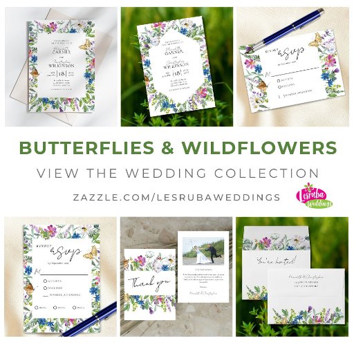 Frühlingseröffnungsfeier Wildblume. Moderne, elegante und farbenfrohe Aquarellblumen, diese skurrilen Wildblumen mit wunderschönen Schmetterlingen sind glücklich und perfekt für Hochzeiten im Frühjahr. Erstellt durch © Lesruba Hochzeiten.