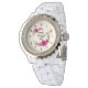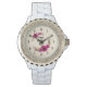 Eine Armbanduhr, die mit hübschen Fuschia-Pappeln und dekorativen Blätter in einem kreisförmigen Blumenkranz entworfen wurde. Herzlichen Glückwunsch Muttertag in einem niedlich angesagten Schriftart. Hübsch und elegant.