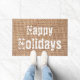 Happy Ferien, Benutzerdefinierter Text und Bild Türmatte. Modernes Design für moderne Zuhause. Schönes Bild von Burlap und weiß angepassten rustikalen coolen Text. Kann in jeder Urlaubssaison genutzt werden.