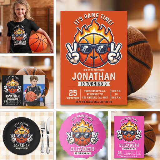 Celebrate your little basketball player with our fun basketball-themed birthday party design. It features a basketball wearing glasses and flames, along with the phrase "IT'S GAME TIME!" The design features sporty typography and can be filled out with your celebration details. Don't hesitate; get this cute design for a basketball-themed birthday party.