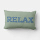 Ein lustiges Lumbalkissen mit dem Wort 'CHILL' in Buchstaben gefüllt mit einem blauen und weißen Muster auf einem weichen grünen Hintergrund.