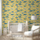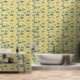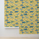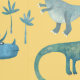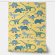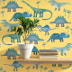 Fun blau und grün Dinosaurier auf sonniger gelber Basis. Tyrannosaurus Rex, Triceratops, Diplodocus, Stegasaur und Spinosaurier. Ideal für ein Kinderzimmer, ein Zimmer oder ein Spielzimmer. Originelle Kunst von Nic Squirrell.