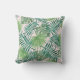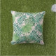 Dieses farbenfrohe Kissen im Freien besticht durch ein Aquarellblau mit tropischen Blätter aus Palmenblättern, die auf einem hellen, rosa Hintergrund gehalten sind.
