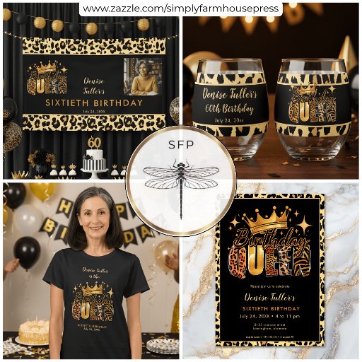 Modern, chic und unterhaltsam, feiert diese Einladung zum Geburtstag die Königin in jeder Frau! Mit einer Mischung aus Leopard, Tiger und anderen wilden Drucken ist diese Einladung in Schwarz, Orange und Gold ein lustiges Design, um einen Meilenstein zu feiern. Erstellt von der einfachen Farmhouse Press.