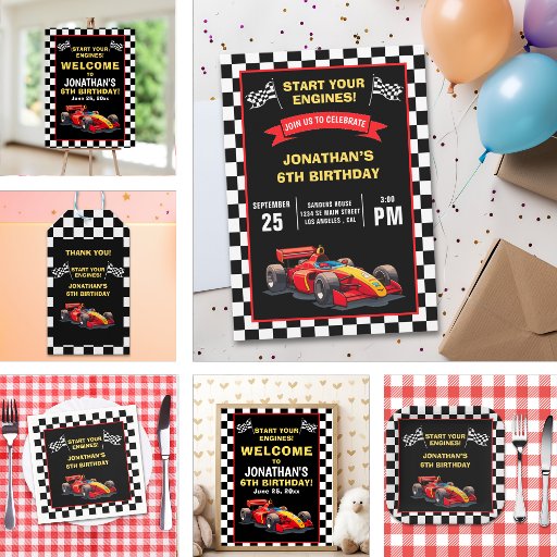 Celebrate your race car loving son with this cute race car driver themed boy birthday design! This design has everything you need to make your son's party an exciting celebration! For complementary products please check out the collection of this cute design.