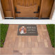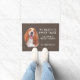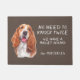"Es ist nicht nötig zweimal zu klopfen, wir haben ein Basset Hound" erklärt diese niedliche Türmatte. Der Text ist rechts in Weiß gehalten, während ein hübsches Bild eines braunen und weißen Basset-Hundes verlassen ist. Alles ist auf graubraunem Hintergrund platziert.