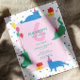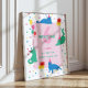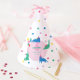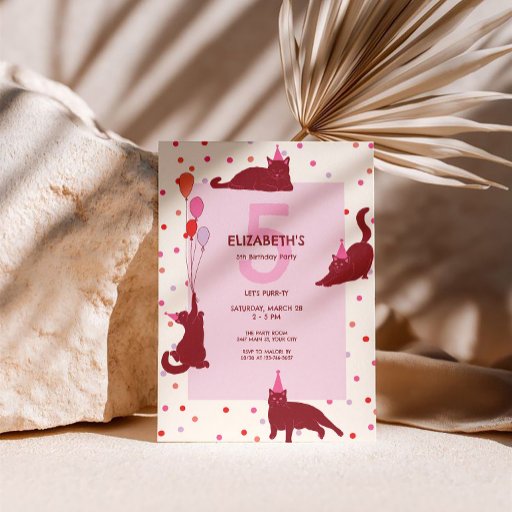 A playful birthday-themed design featuring deep cats in tiny party hats, surrounded by pastel balloons, confetti dots, and a soft pink centerpiece.