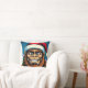 A funny Sasquatch Christmas throw pillow with a comic book style pop art sasquatch smiling with a Santa and Christmas lights on.