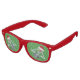 Diese Retro-Party-Brille hat ein lustiges Weihnachtsgeschoss mit einer roten Weihnachtsmannmütze, die runde Ornamente auf einem grünen Hintergrund aufhält.