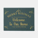 Feierliche Weihnachten vor der Tür mit goldenem Misteloe auf einem tief aquamarinen Grün. Fügen Sie Ihren eigenen lustigen Slogan und Familienname, sagte ich Merry Kissmas!