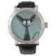 Funny Niedlich Black Cat Art on Blue Damask Armbanduhr
