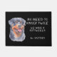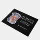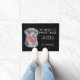 "Keine Notwendigkeit, zweimal zu klopfen, Wir haben einen Rottweiler" erklärt diese lustige Türmatte. Der Text ist auf der rechten Seite silbergrau, auf der links ist ein Schwarz-Bein-Rottie-Bild. Alles ist auf einem schwarzen Hintergrund platziert.