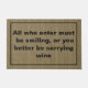 Grafische Türmatte aus Grasmatte, mit einem schwarzen Rahmen, um den Rand. Fett schwarzer Text lesen Alle, die eingeben müssen lächeln, oder Sie besser tragen Wein ist vollständig Brauch und kann personalisiert sein, zu lesen, was Sie gewollt.