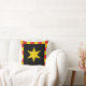 "Sable, ein Mullet von sechs Punkten oder innerhalb einer Schnürung oder mit Schlägen." Abzeichen für das Fürstentum Vindheim in der Gesellschaft für kreativen Anachronismus. Die Kissenrückseite ist ein mittelalterliches Muster in der Farbkoordinierung.