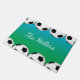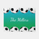 Fußball-Bälle auf blauem und grünem Hintergrund mit Ihrem eigenen Familiennamen, Monogramm oder einem anderen Text in der Mitte machen eine lustige Tür für eine fußballliebende Familie.