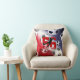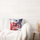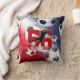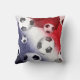 Das viereckige Kissen für weibliche Fußball-Spieler mit den amerikanischen Farben zeigt ein Muster von Fußballbällen unterschiedlicher Größe, die mit einer digitalen, bedrückten Textur und einem diagonalen rot-blauen Thema kombiniert werden - eine silhouettierte Fußballspielerin, die einen Fußball tritt, ist vorne und Mitte, die ihre Jerseynummer (Anzahl und Farbe der Zahl sind anpassbar, derzeit rot) und ihren individuellen Namen überlagert Jersey-Nummer - von katz_d_zynes