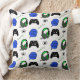 Gaming-thematisches Kissen mit Kalkgrün und schwarz Grafiken wie Kopfhörer, Controller und Text-Level-Up.