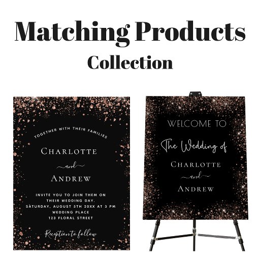 Ein stilvoller schwarzer Hintergrund mit goldenen Rose Imitaten Glitzern. Fügen Sie Ihr Foto, die Namen und das Hochzeitsdatum hinzu. Die Namen werden mit einem modernen handgeschriebenen Stilskript geschrieben.