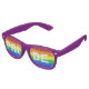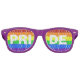 Rot-, Orange-, Gelb-, Grün-, Blau- und lila Streifen auf cooler Sonnenbrille für eine Gay Pride-Parade mit weißem PRIDE auf den Farben.