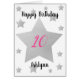 Personalisierte Geburtstagskarte mit silbernen Sternen, die über die Vorderseite springen. Mit ihrem Geburtstagsalter und ihrem Namen unter dem Stern können Sie den großen Silberstar leicht personalisieren. Die Insider-Karte-Nachricht lautet: "Für ein Mädchen, das Glitzern und glänzt wie kein anderes! Herzlichen Glückwunsch zum Geburtstag!" kann auch leicht personalisiert sein, wenn Sie gewollt. Die Rückseite der personalisierten Geburtstagskarte lautet "Happy Birthday 2018".
