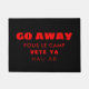 Lustige AntiFußmatte. Kundenspezifischer Farbhintergrund. Addieren Sie leicht zusätzlichen Text, wenn Sie gewünscht werden. Sagen Sie gehen weg in vier verschiedene Sprachen - Fous le Camp (französisch), Vete Ya (spanisch), Hau AB (deutsch).