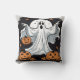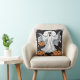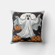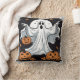 Ein verspielter Geist schweben über geschnitzten Kürbissen unter Vollmond, umgeben von Herbstblättern und einem dunklen Himmel, der das Wesen der Halloween-Festlichkeiten einfängt.