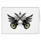Gekreuzte Gitarren und Schädel auf T - Shirts und Geschenken für Gitarrenspieler und Musikliebhaber. Bass-Gitarren mit den Schädeln und Wappenkundehintergrund.