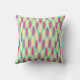 Dieses Kissen ist geometrisch gestaltet und besteht aus einem Hintergrund von blaugrünen und hellblauen Rechtecken mit gelben und rosa Ovalen.
