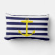 Eine helle gelbe Silhouette eines Ankers ist auf einem Marineblau- und weißengestreiften Hintergrund. Ein Spaß, Seeentwurf.