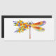 Künstlerisch bemalt, florale Libelle in kontrastierender Orange und lila mit gelben, hellen, blühenden kalifornischen Mohn und blauen Wildblumen auf weißem Hintergrund.