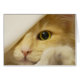 Foto einer gelben norwegischen Waldkatze, die unter einem Blatt herausguckt.