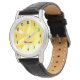 Eine hübsche gelbe Uhr mit einem Aquarellbild mit einer abstrakten Blume. Die Uhr kann mit dem Namen des Besitzers personalisiert werden, um sie zu einem besonderen Erlebnis zu machen.