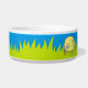 Ein Kute und ein Funny yellow bird cartoon on on grass and sky background. Custom Text.