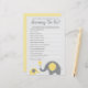 Testen Sie, wer die Mama-to-be am besten kennt, mit unserem Quiz-Spiel "How Do You Know the Mommy to Be" mit dem Thema gelb und grau. Die Gäste füllen die Felder aus, um einige grundlegende Fragen zur junge Mutter zu beantworten. Wer das Richtigste bekommt, gewinnt!
