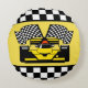 Gelber Rennwagen: Schachbrett-Flagge Rundes Kissen