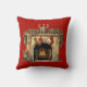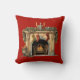 Ein Kissen mit einer warmen und gemütlichen Illustration mit einem altmodischen Kamin. Strumpf hängt mit Sorgfalt. Über dem Kamin hängende Gärten. Ein warmes, brüllendes Feuer im Herzen.