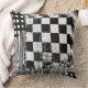 A warped checkered pattern with a collage of abstract geometric shapes.