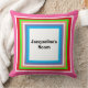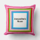 Spaß mädchenhaft Muster mit Name Room geschrieben in schwarzer Typografie vor weißem Hintergrund. Monogramm auf der Rückseite in Weiß vor solidem, hellrosa Hintergrund. Himmelblau, weiß, hellpfirsich, Limettengrün, rot, rosa geometrische Quadrate. Original Design © TamiraZDesign.