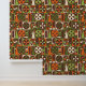 Dieses originelle, im Retro-Stil der 1950er/60er Jahre abstrakte geometrische Muster-Tapete besteht aus Dreiecken, Quadraten, Rechtecken und Kreisen. Es ist in Vintagen Orange-, Grün- und Cremetönen auf braunem Hintergrund gestaltet. Dieses hübsche Muster wiederholt sich nahtlos. Es ist für Fans der Moderne des 20. Jahrhunderts. Fügen Sie eine Touch antiker Mod Eleganz mit diesem cool minimalistischen Motiv hinzu.