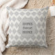 Schönes grau geometrisches Rautenmuster auf einem fast weißen Hintergrund. Die Vorderseite des Kissens hat einen großen grauen Punkt mit dem Text: Zuhause Sweet Zuhause.