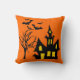 Ein gespenstisches altes Spuk schwarzes Haus wird mit einem gelben Glühen in den Fenstern geleuchtet. Es ist Halloween-Nacht und Schläger fliegen oben nahe bei einem hohen schwarzen toten Baum. Alle auf einem orange Hintergrund des Feiertags und die Rückseite ist feste Orange.
