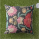 Reich gestickte Blumen auf schwarzem Hintergrund mit hellem rotem Kissen zurück zu bringen das helle Rot in der Stickerei heraus.