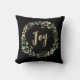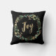 Dieses herrliche Kissen bietet einen festlichen Aquarellkranz mit goldenen Blätter, Weihnachtsgrün und roten Heiligen Beeren auf einem modernen schwarzen Hintergrund. Das Wort "Freude" wird in eleganten Imitaten in Goldkalligraphie vorgestellt.