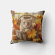 Eine Ingwer-Katze sitzt in einem Korbkorb, umgeben von Herbstblättern und Kürbissen auf einem Tisch