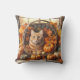 Eine Ingwer-Katze in einer Kornkammer, umgeben von Herbstblättern und kleinen Kürbis durch ein sonniges Fenster